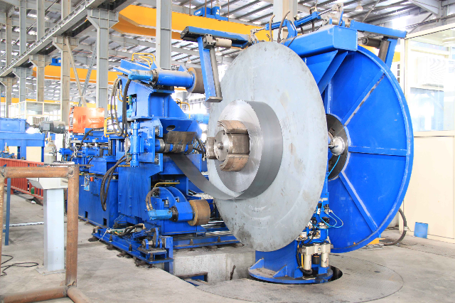 The coil feeder un-bands the strip and automatically feeds it through a coil leveler to a sheer press. After the incoming strip is sheered, it is aligned with the tail of the previous coil and a robotic TIG welder welds the two together.